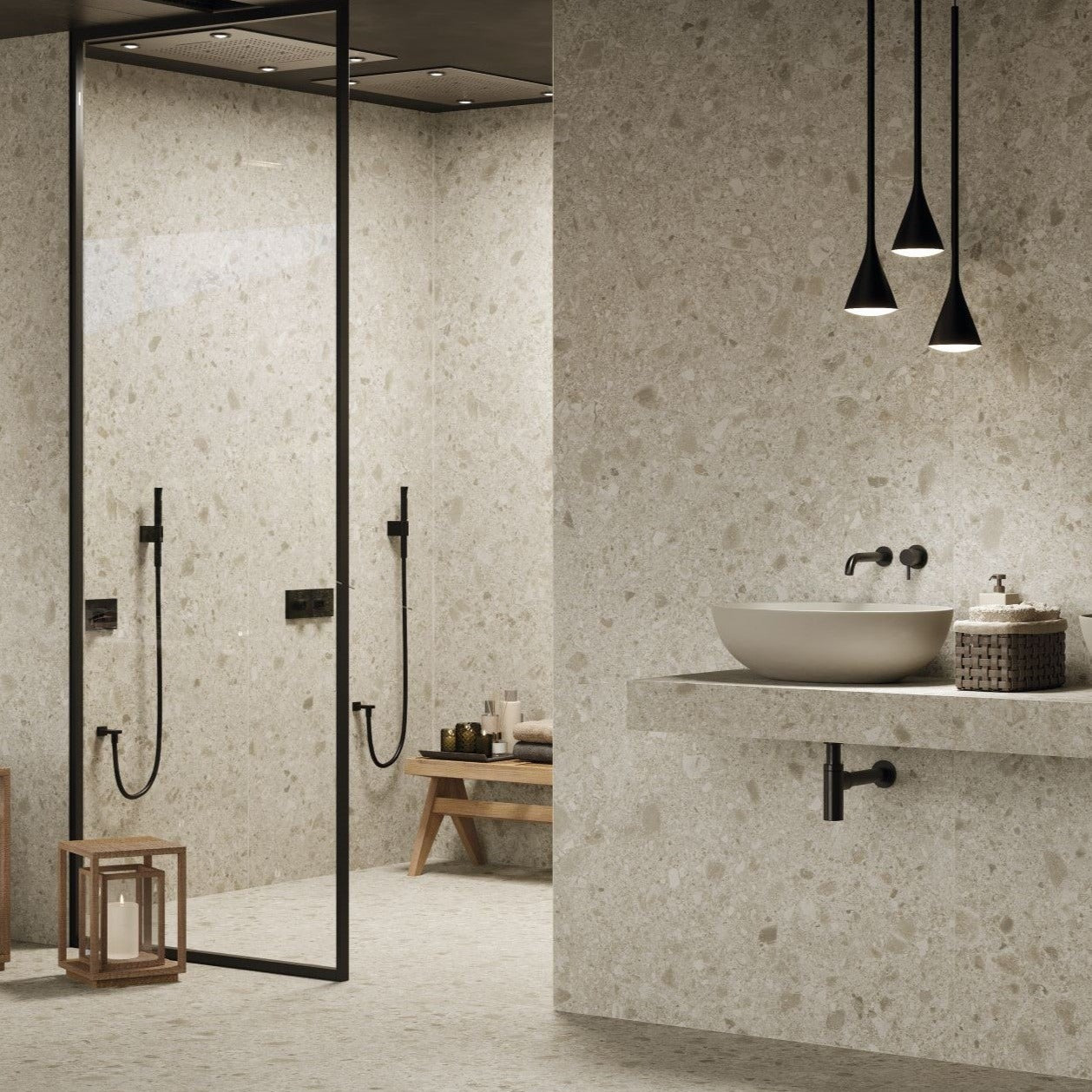 Fliser med struktur og relief skaber liv uden at være urolige. Samtidig ser man flere badeværelser hvor fliser går fra gulv til loft. Denne løsning skaber sammenhæng og en omsluttende fornemmelse, som understøtter spa følelsen.