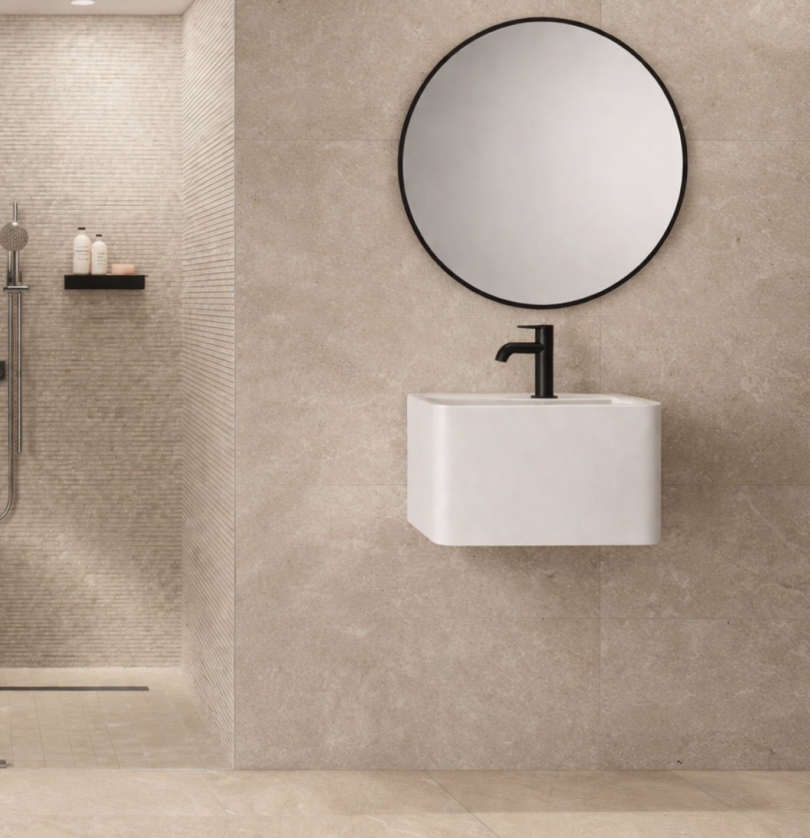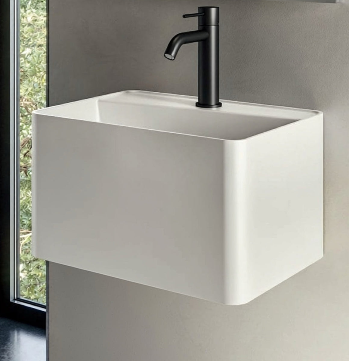 Møblet London er fremstillet i mat hvid solid surface og har et elegant, minimalistisk design, der passer perfekt ind i moderne badeværelser.