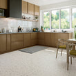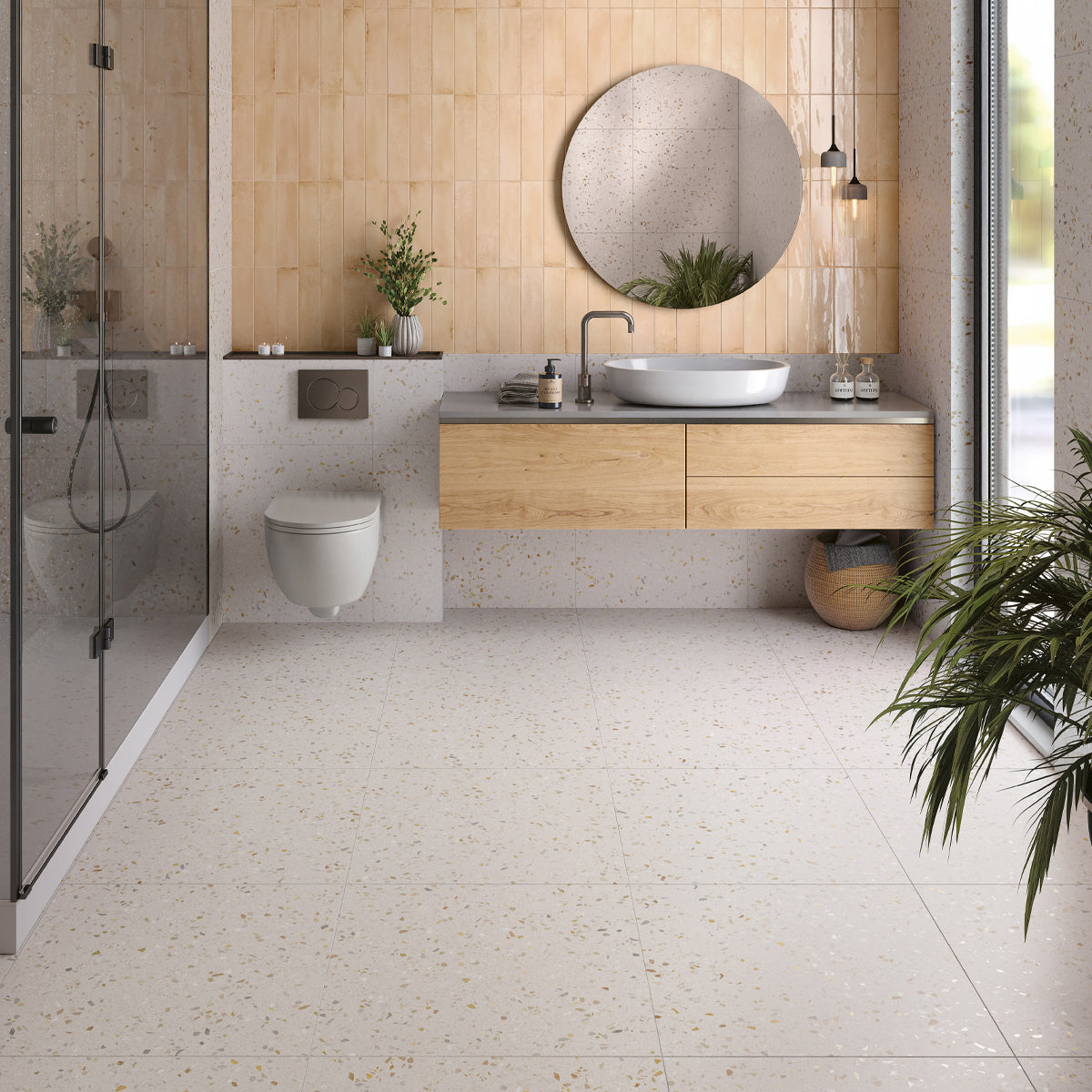 Let og lys terrazzo look flise i 2 størrelser og 2 farver.
